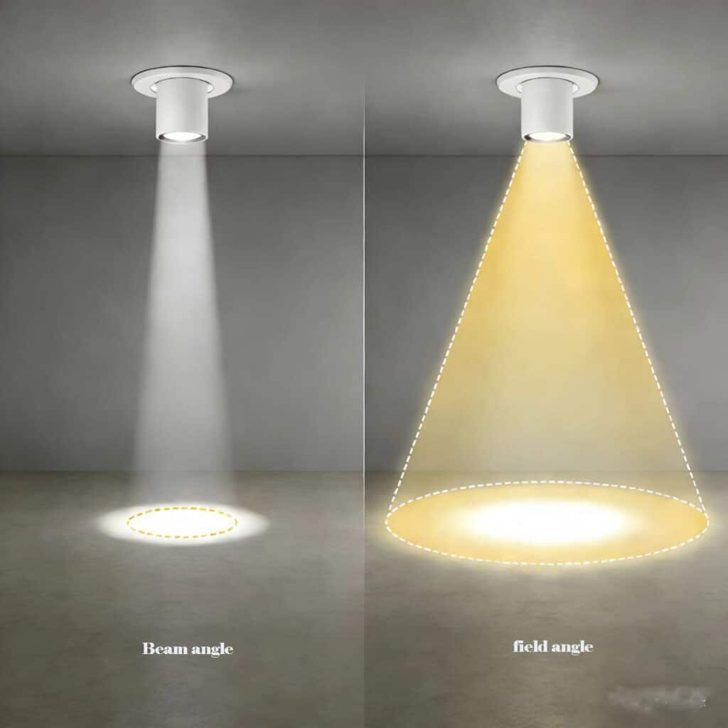 If the same light source is used in reflectors with different angles, the larger the beam angle, the smaller the central light intensity, and the larger the spill light. The smaller the beam angle, the greater the ambient light intensity and the worse the scattering effect. Taking the common recessed adjustable downlight as an example, its beam angles are 10°, 24°, and 38°.