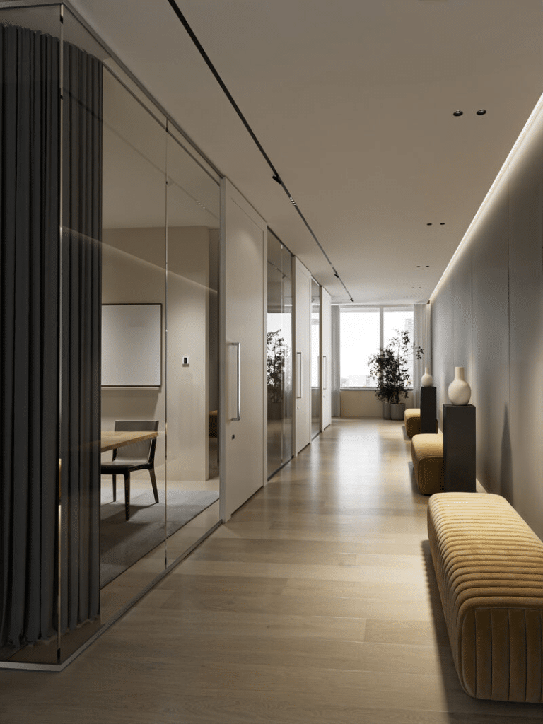 As the largest area in the office, employees’ work behavior, interaction, and communication, and even personnel negotiation and other functions happen here. Generally, a uniform spacing lighting layout is used, combined with corresponding lighting fixtures for ground functional areas. Each workstation area is equipped with a linear light to make the workspace lighting even and reduce glare. Energy-saving LED downlights are used for corridor areas to supplement lighting.